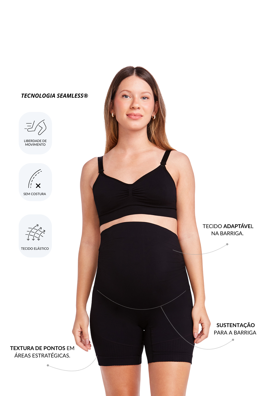 - Acompanha o Crescimento: Possui o exclusivo cós duplo canelado com tecido adaptável na região abdominal, desenhado para acomodar a barriga em todas as fases sem apertar.
