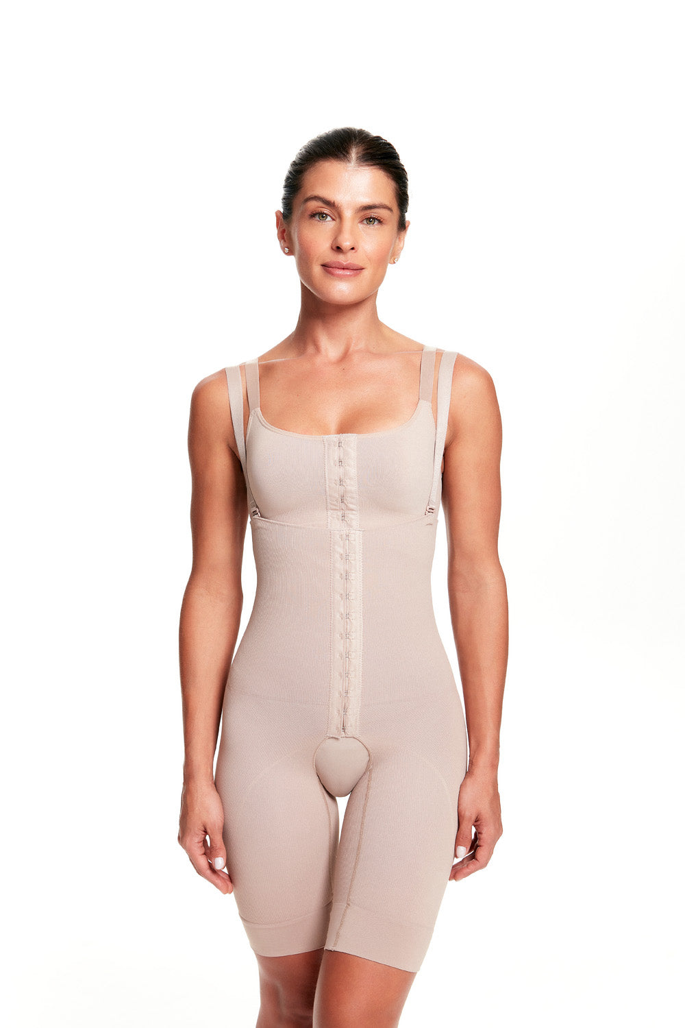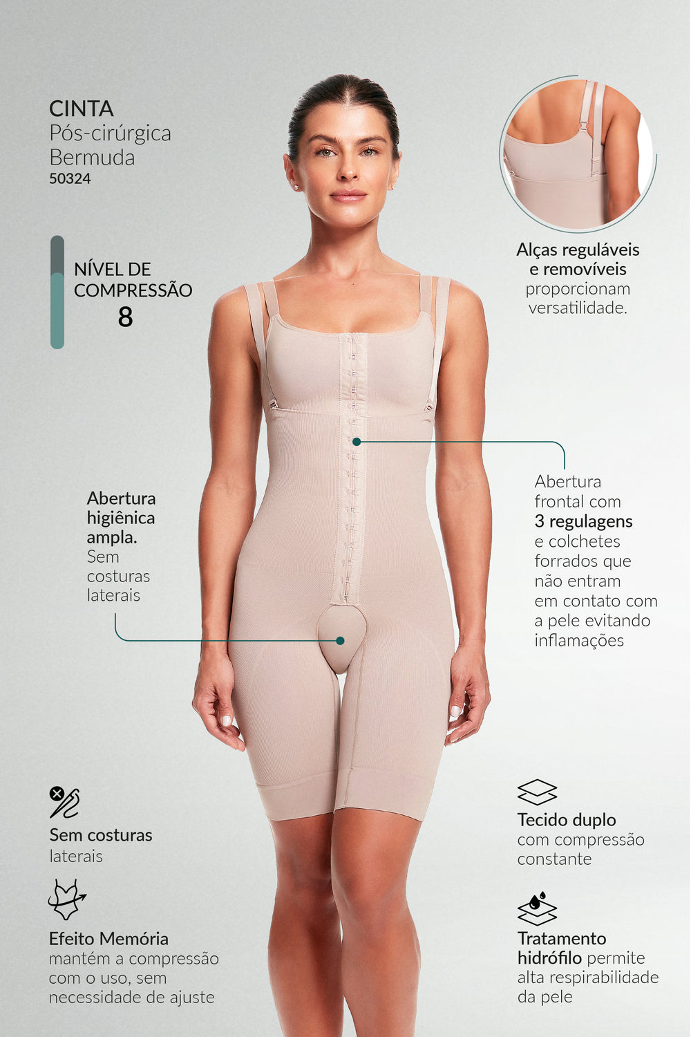 - Abertura frontal com três regulagens e colchetes forrados, evitando contato direto com a pele.