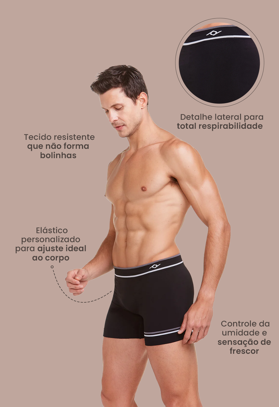 O design sem costuras oferece um toque macio e suave, garantindo um ajuste perfeito com total liberdade de movimentos, e sem enrolar nas pernas. Com tratamento hidrófilo, permite que a pele respire livremente, elevando o conforto a um novo patamar.
