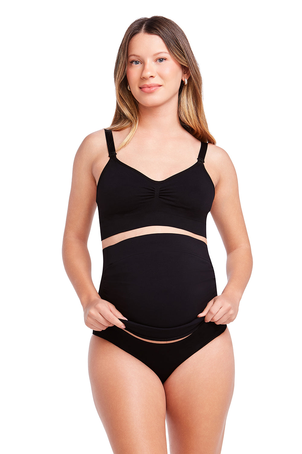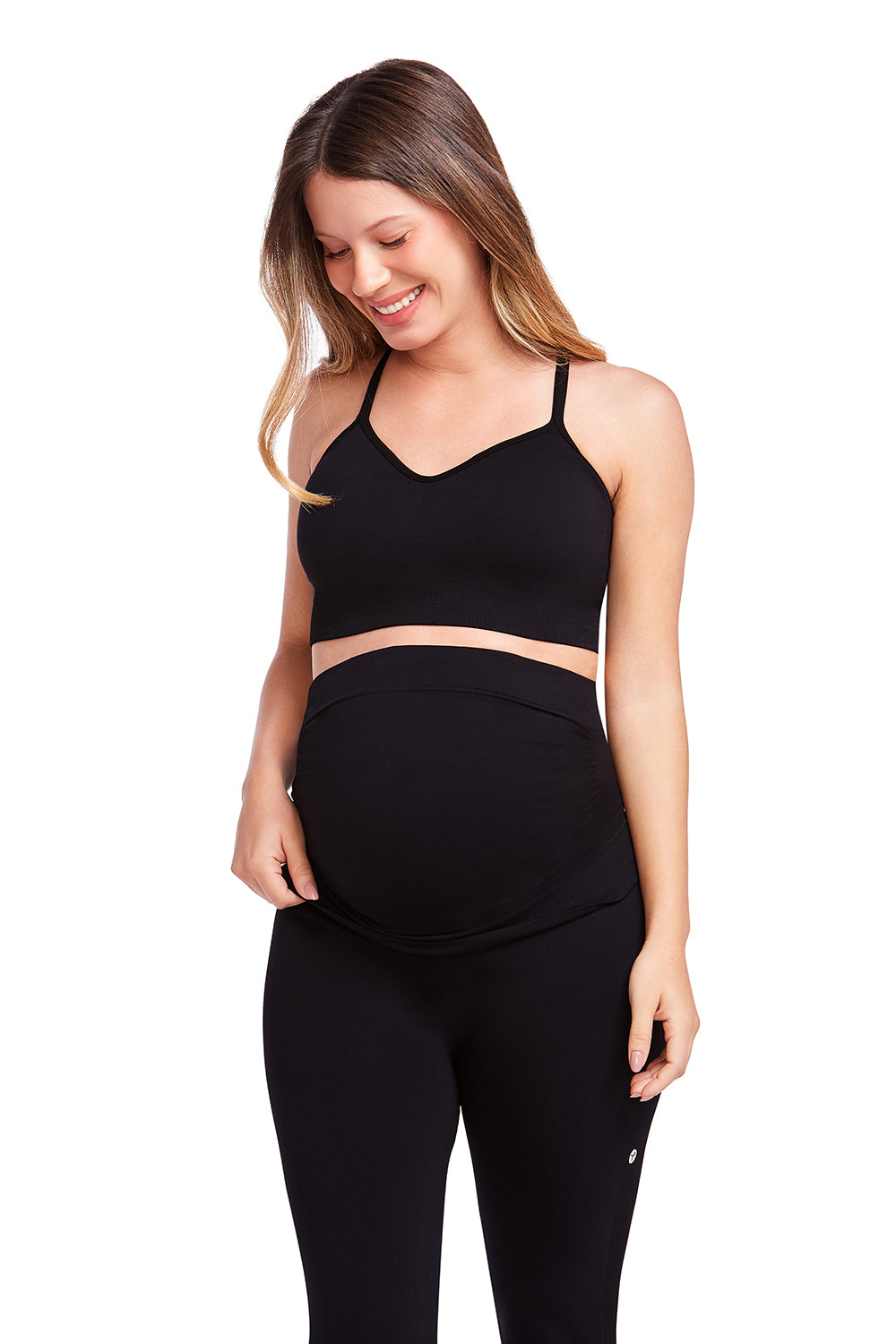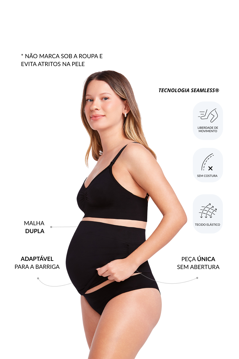 - Alívio Lombar: Conta com uma faixa de compressão estratégica na parte posterior, desenhada para sustentar a lombar, compensar o peso da barriga e aliviar desconfortos nas costas.