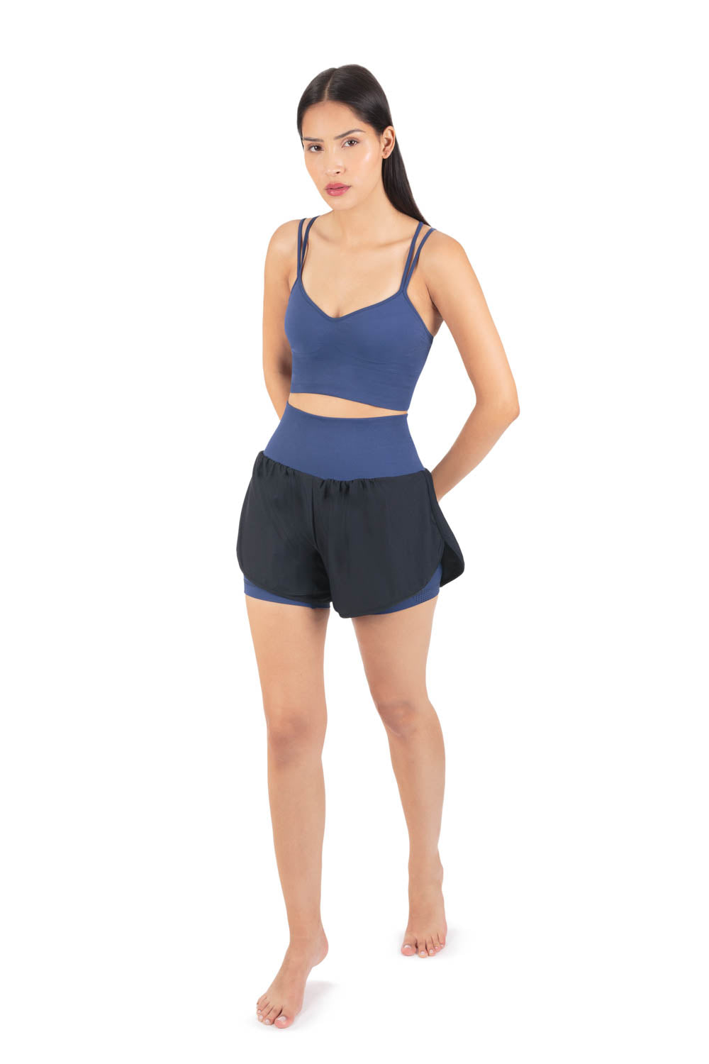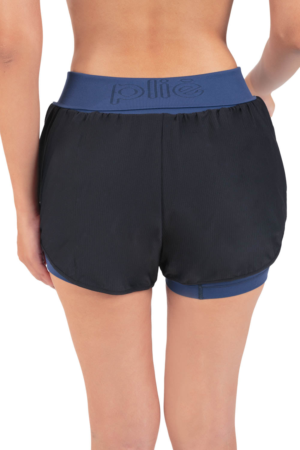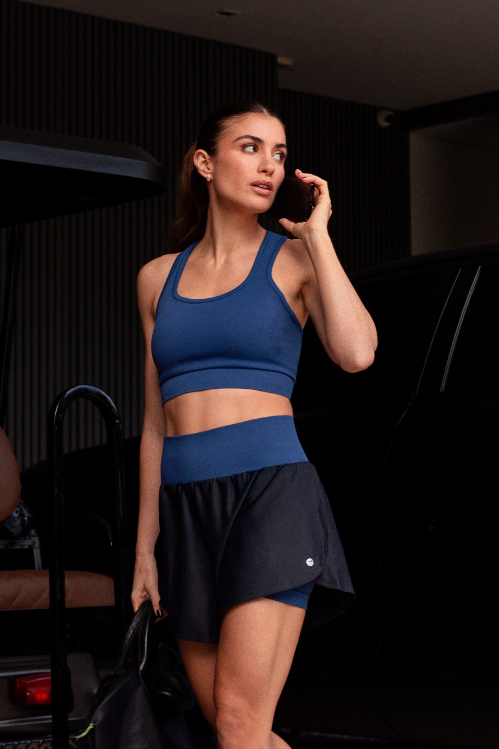 O short sobreposto em tecido leve e com elasticidade proporciona liberdade total nos movimentos, enquanto o design esportivo com pontos pretos nas laterais adiciona um toque moderno e dinâmico.