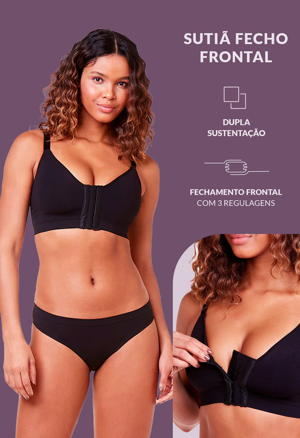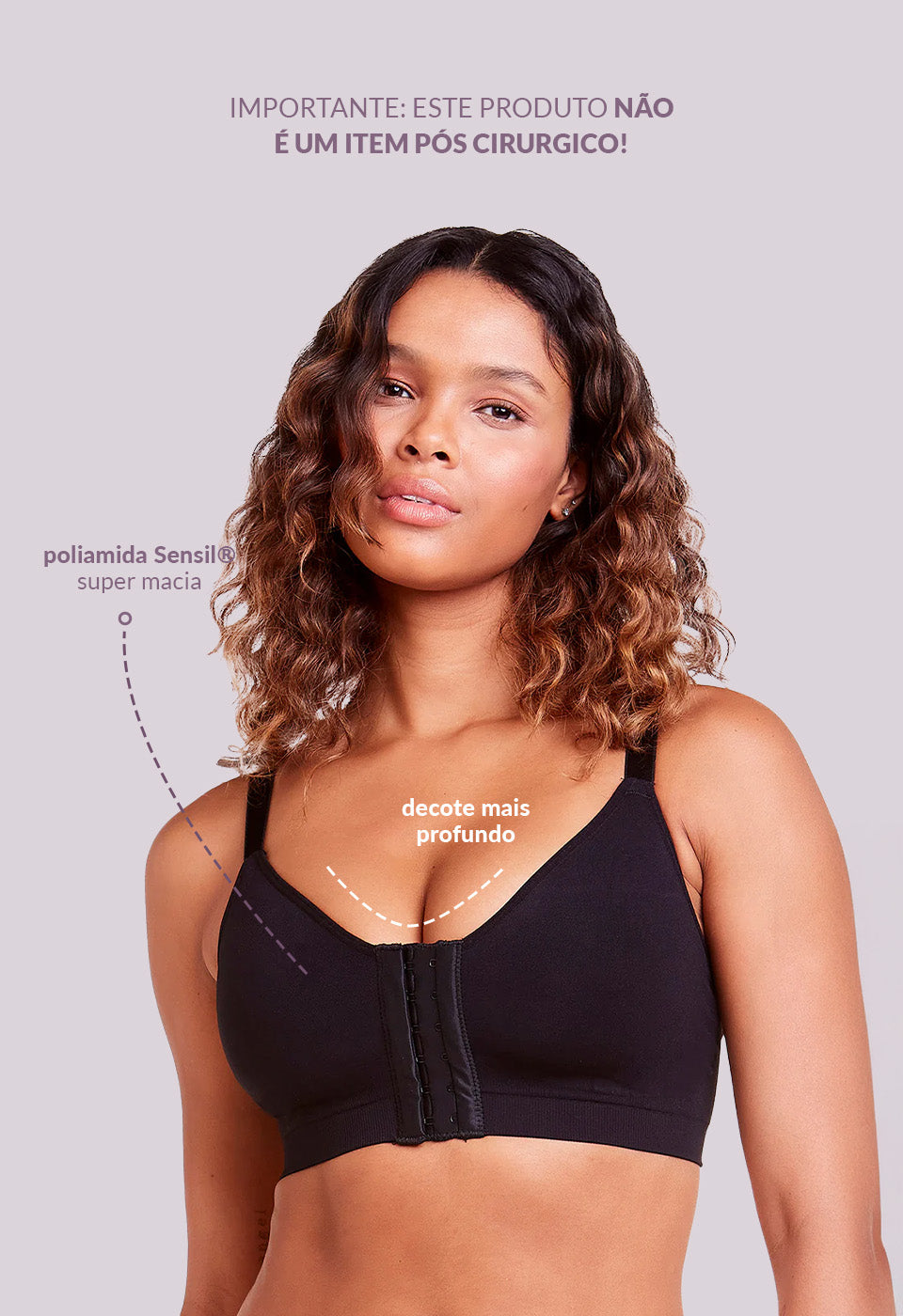 Sutiã com dupla sustentação, fechamento frontal e decote mais profundo.