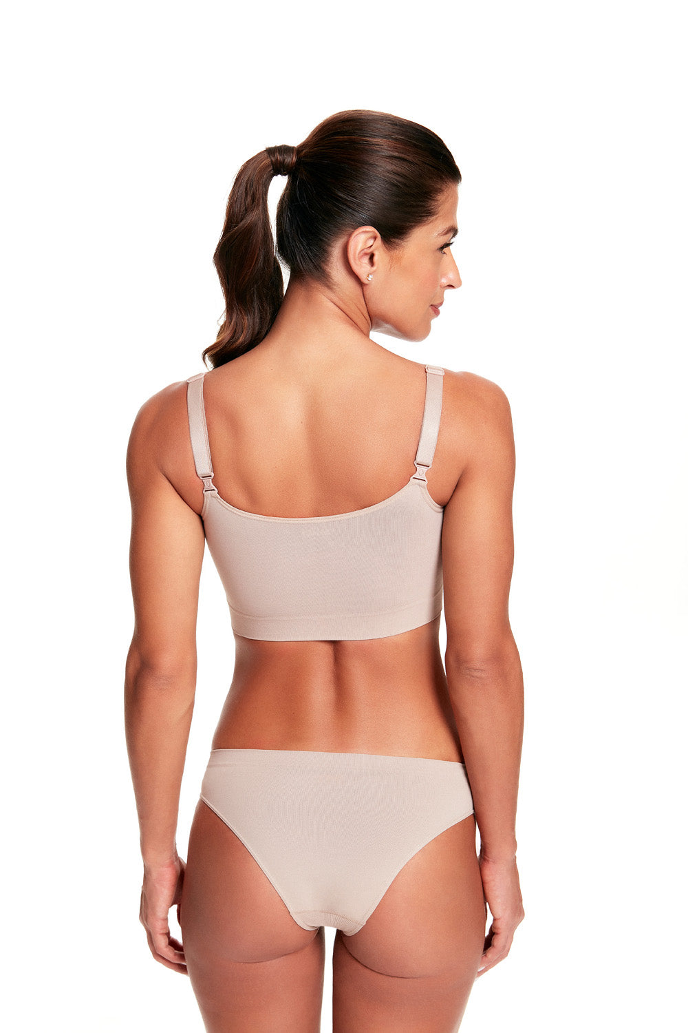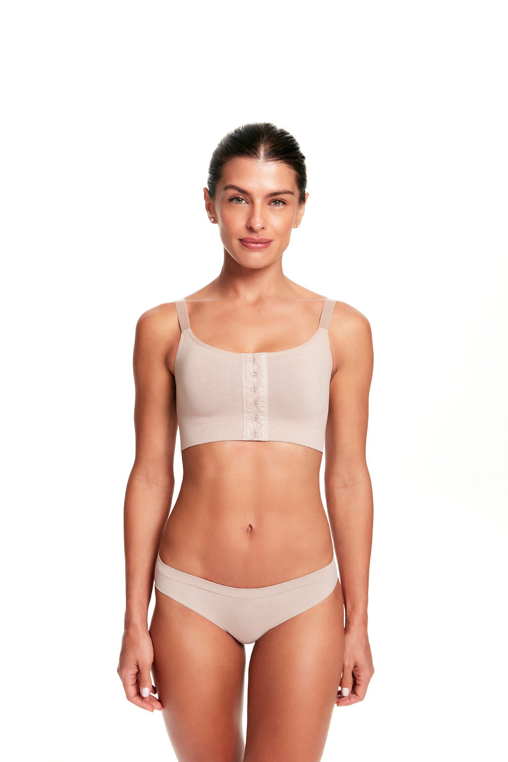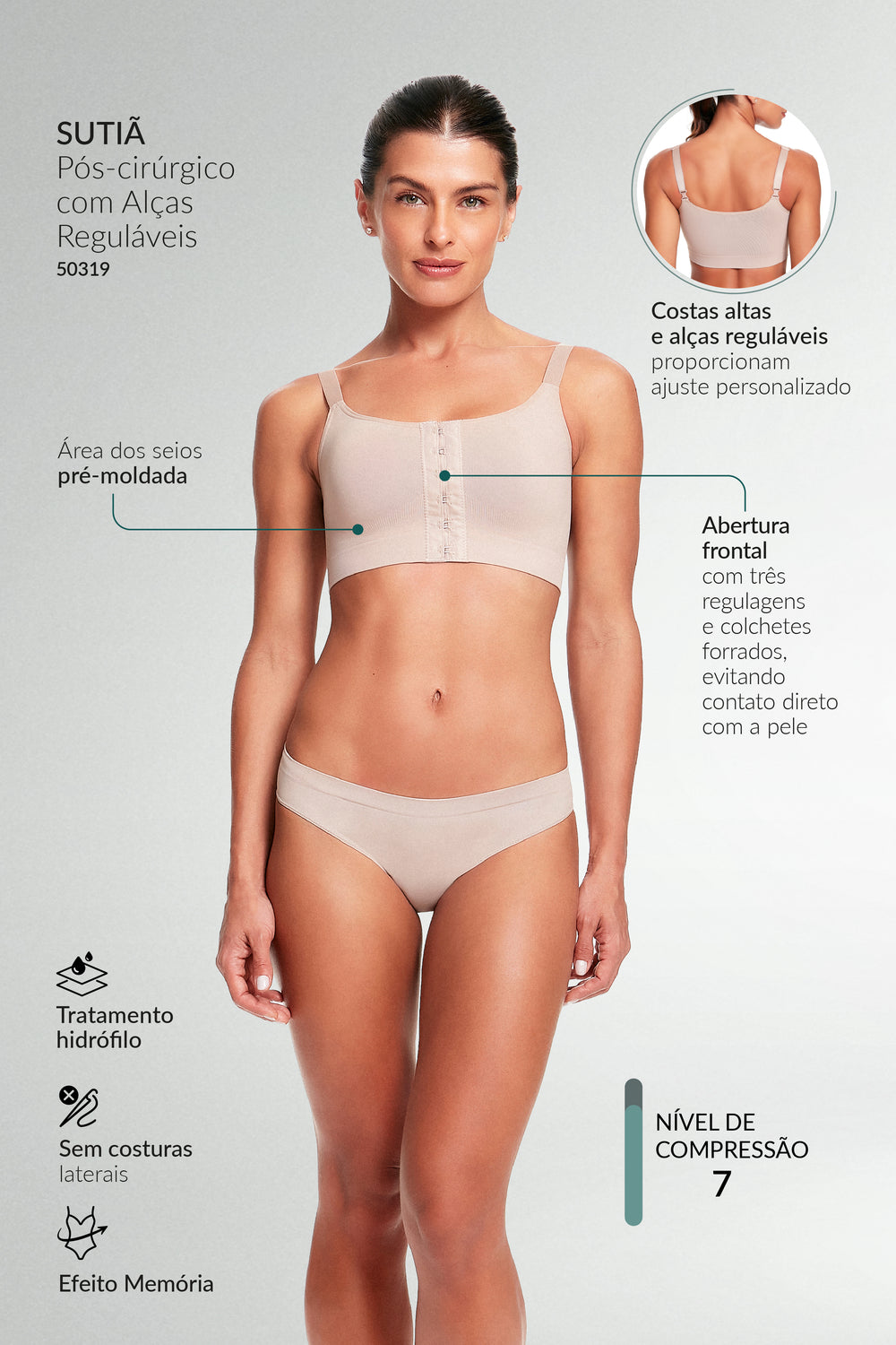 - A área dos seios é pré-moldada, e não há costuras laterais para maior conforto. O tratamento hidrófilo promove alta respirabilidade da pele.