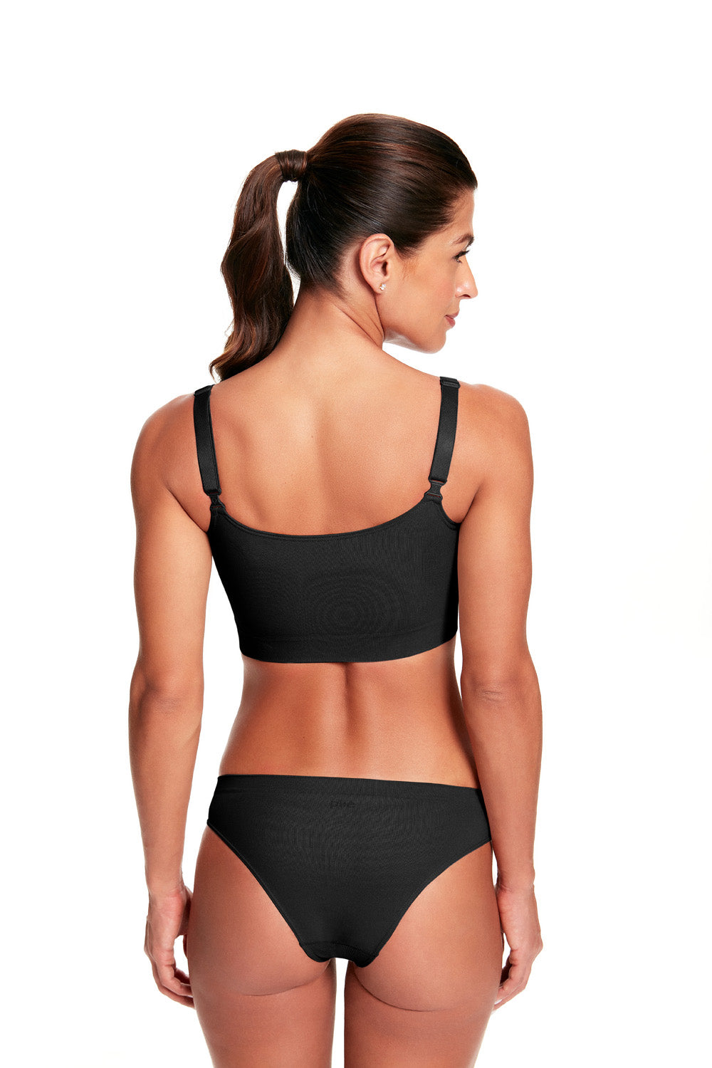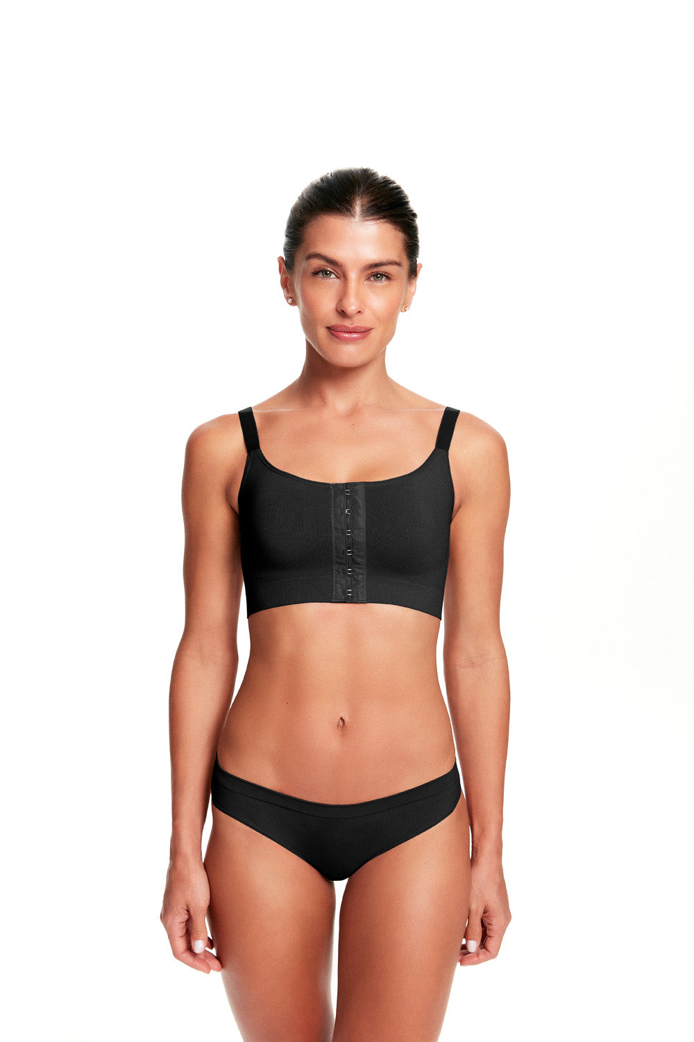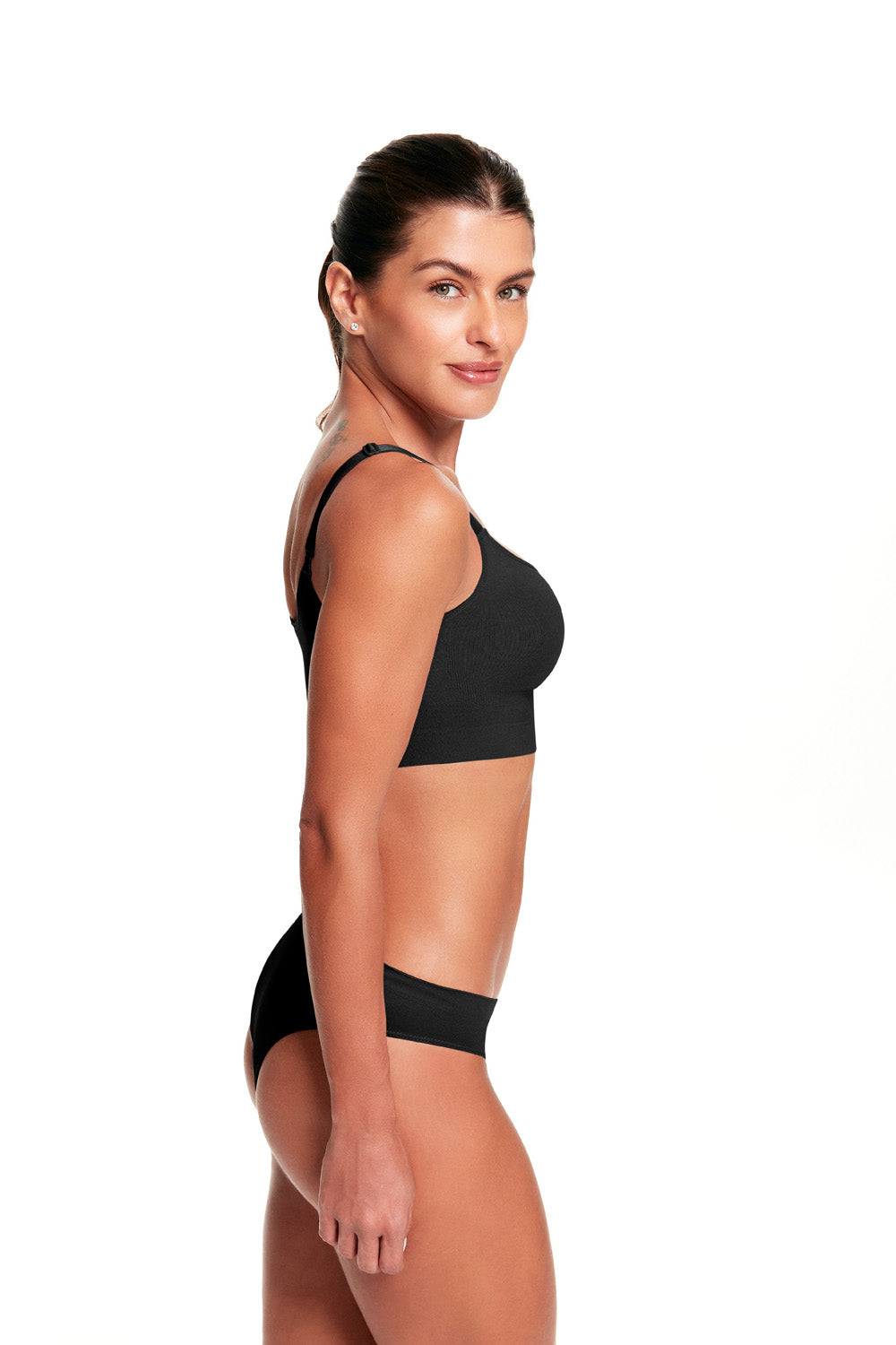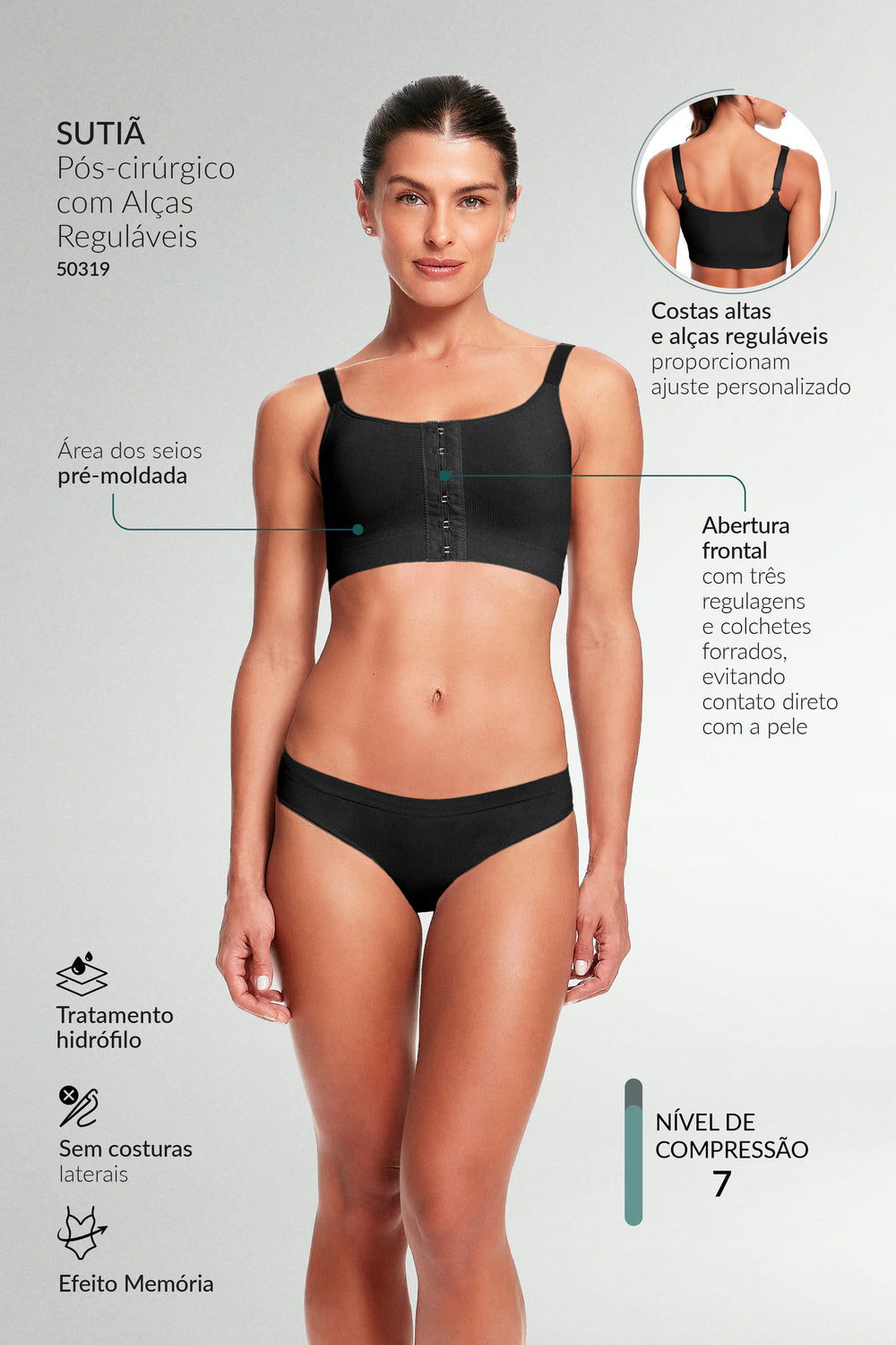 - A área dos seios é pré-moldada, e não há costuras laterais para maior conforto. O tratamento hidrófilo promove alta respirabilidade da pele.